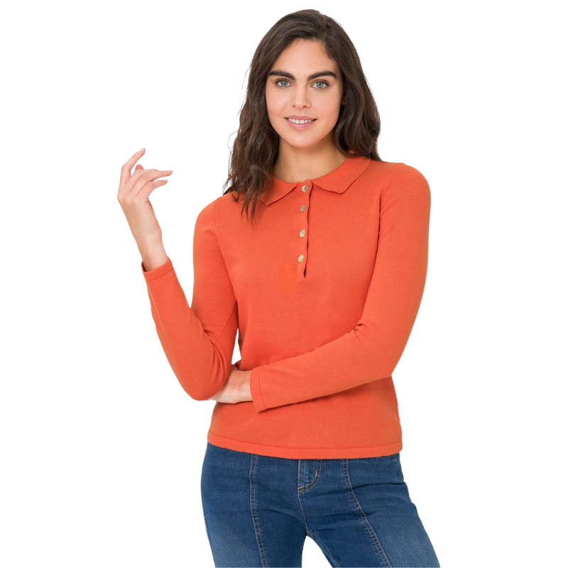 El Polo Camisero Pique Manga Larga Naranja para Mujer combina energía, frescura y elegancia en una sola prenda.